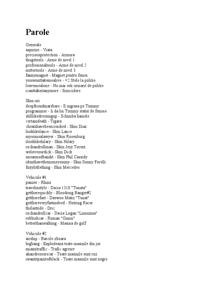 Parole De Masini Gta Vice City