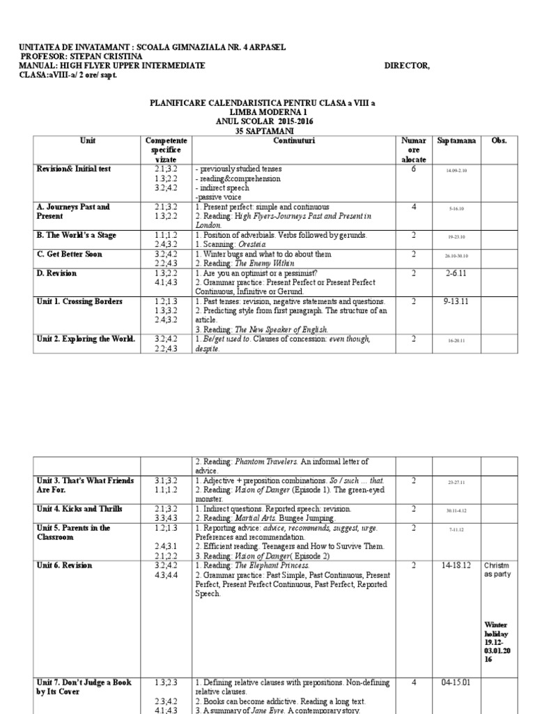 Planificare Clasa A Viii A L1 High Flyer Upper Int 1