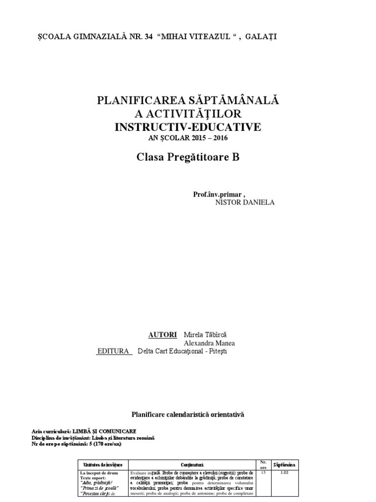Doc Mirela Tăbircă Planificarea Săptămanală A Activităţilor Instructiv Educative Clasa Pregătitoare Geta Rebega Academia Edu